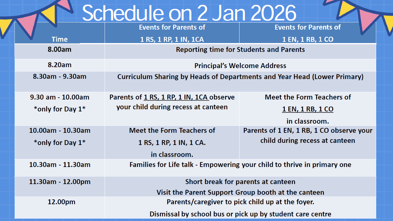 We hope this message finds you well. We are excited to welcome your child to their first day of Primary 1 on Friday, 2 January 2026.